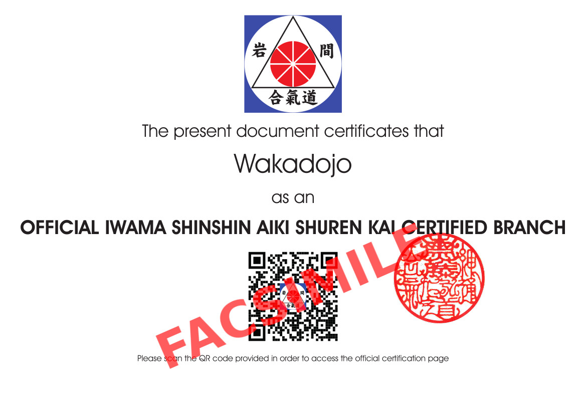 Il Wakadojo è l'unico dojo della provincia di Viterbo riconosciuto a livello internazionale dall'associazione giapponese Iwama Shin Shin Aiki Shuren Kai (ISSASK) della famiglia Saito. La ISSASK è internazionalmente nota e stimata per il lavoro di divulgazione dell'Aikido tradizionale, una delle poche scuole che ha conservato lo stile efficace e sincero come fu sviluppato dal fondatore Morihei Ueshiba. È possibile vedere la lista completa dei dojo ISSASK mondiali e verificare l'iscrizione del Wakadojo al link: dojo.iwamaaikido.com . Di seguito il Faxsimile dell'attestato annuale di riconoscimento dell'affiliazione.